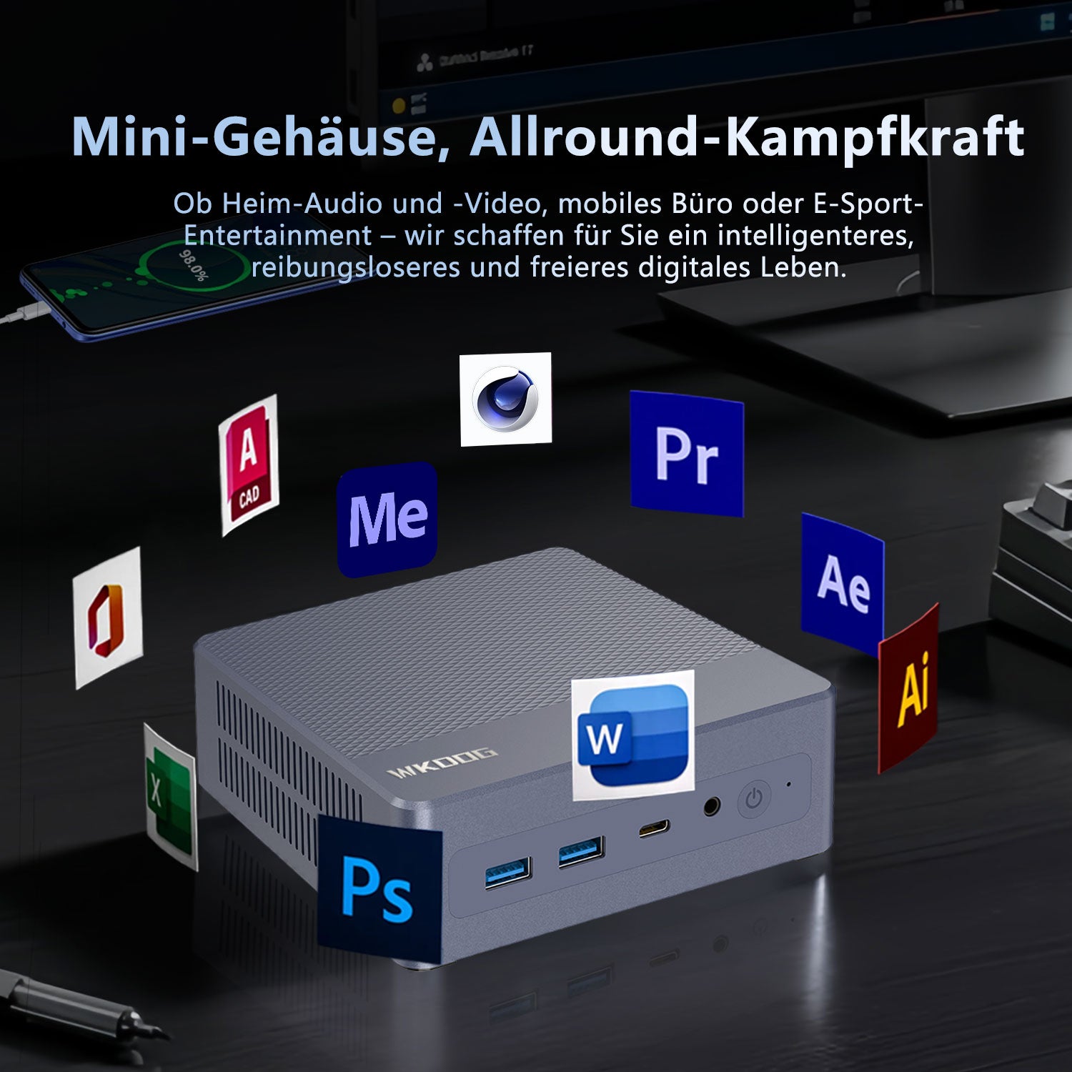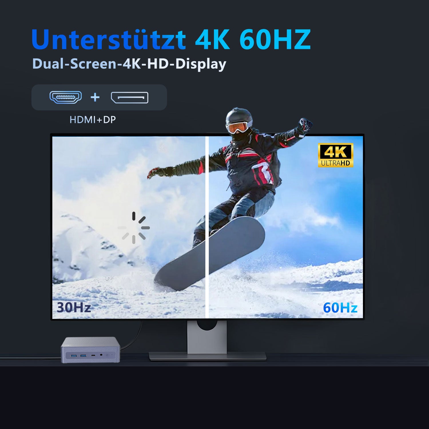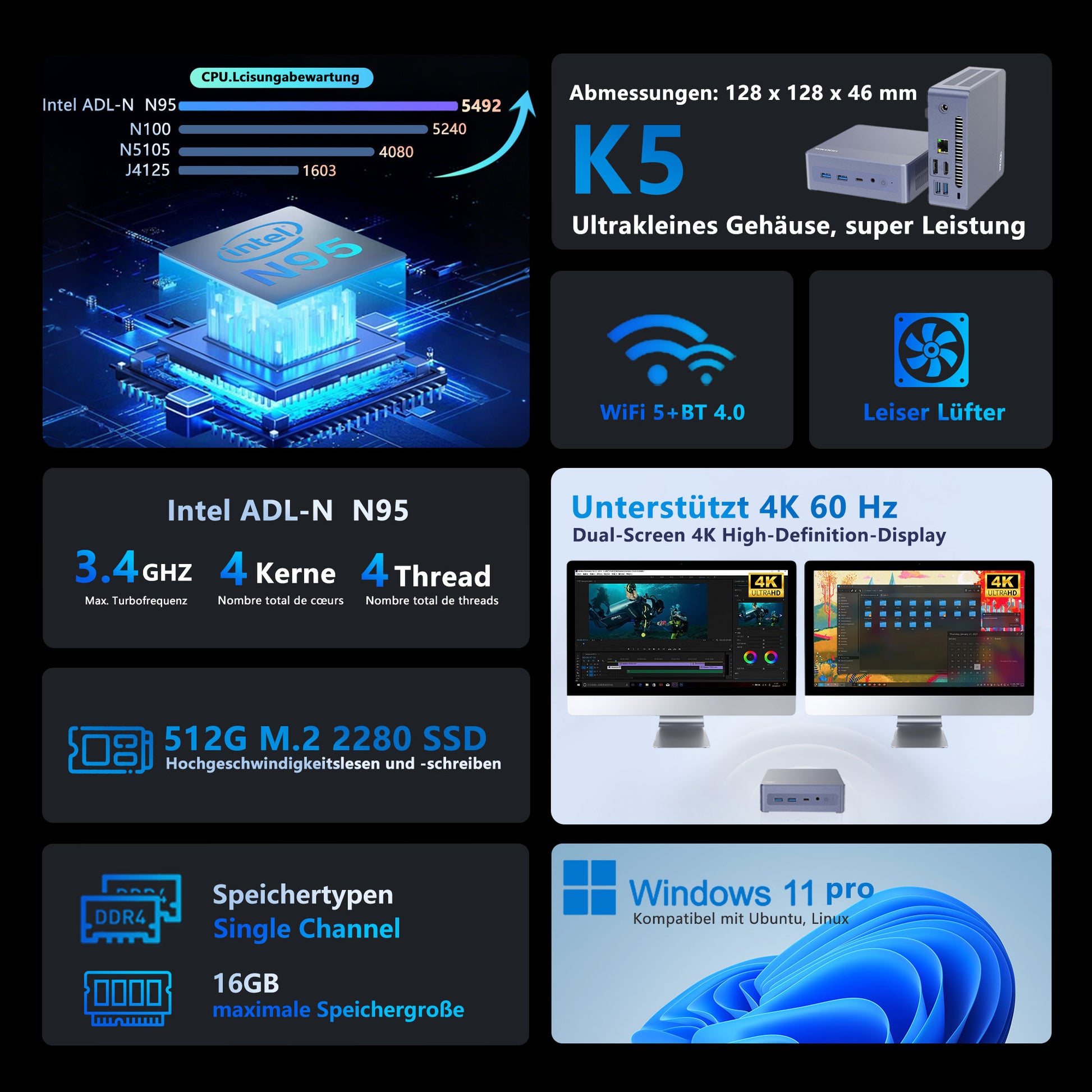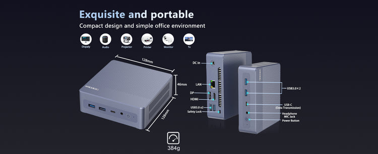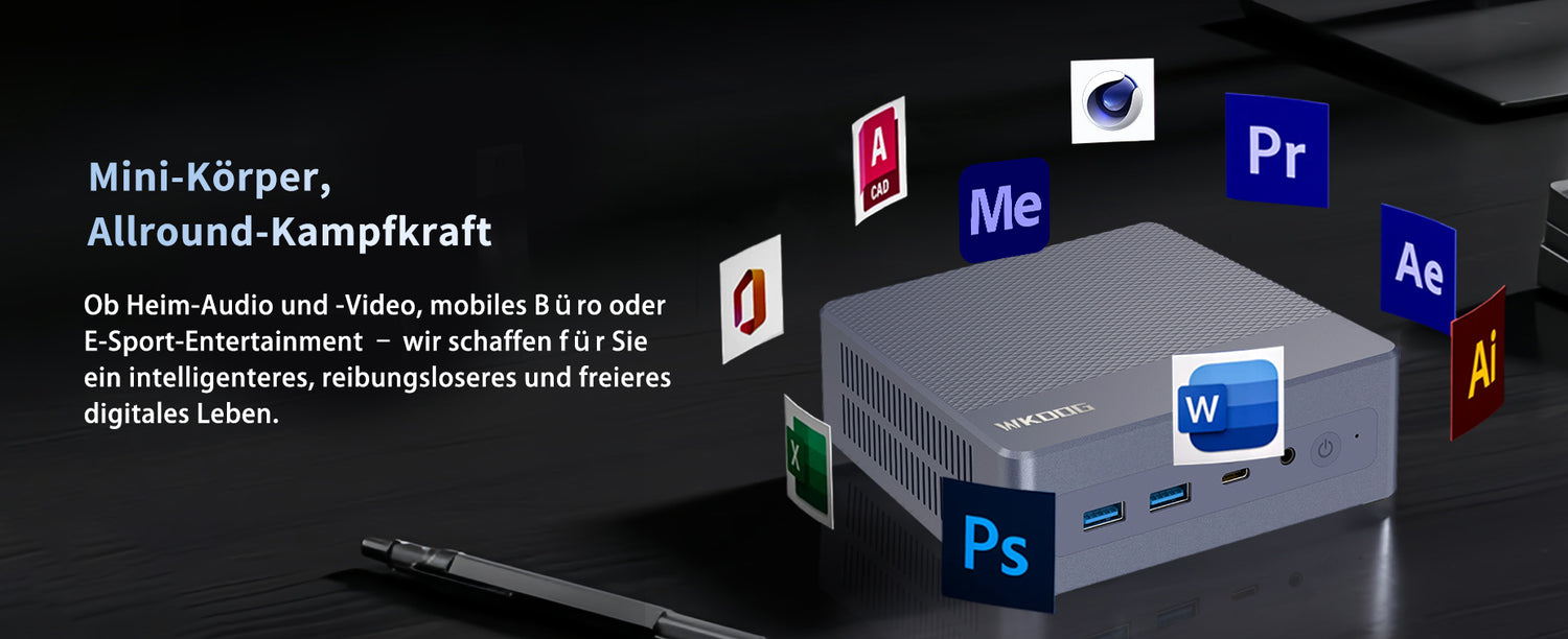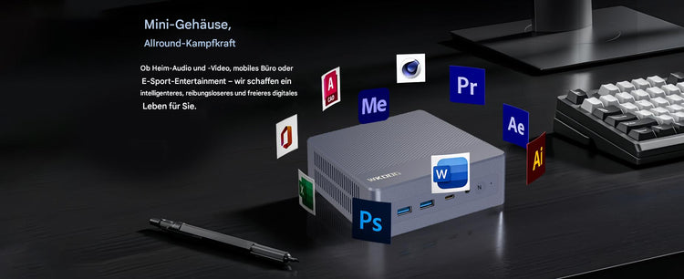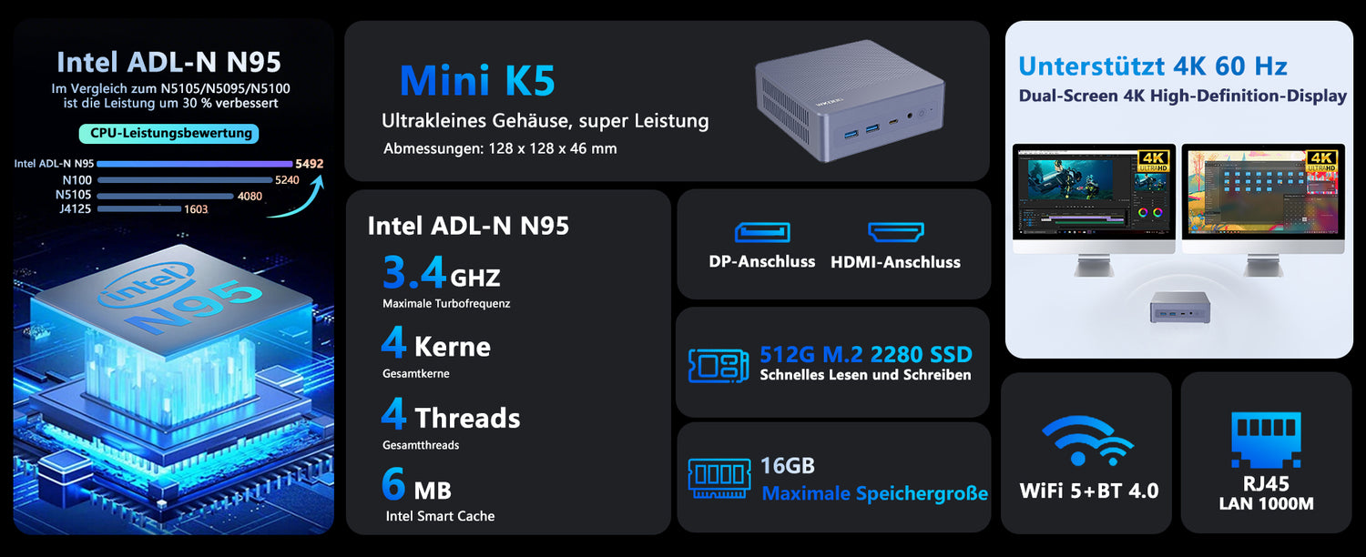 Der Mini K5 ist ein leistungsstarkes, kompaktes Computergerät für effiziente Büro-, Unterhaltungs- und Kreativanwendungen. Die Kernkonfiguration umfasst eine M.2 2280 SSD, die schnelles Lesen und Schreiben unterstützt, die Systemreaktionsgeschwindigkeit und Dateiübertragungseffizienz deutlich verbessert und das Booten des Systems, das Laden von Software und die Verarbeitung großer Dateien problemlos bewältigt. Der Mini K5 ist mit einem leistungsstarken Prozessor und einer integrierten Grafikkarte ausgestattet, unterstützt Multitasking und eine flüssige Grafikdarstellung und erfüllt damit die Anforderungen des täglichen Büros, der audiovisuellen Unterhaltung und der Lichtgestaltung.