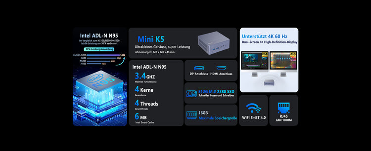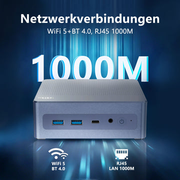 Suchen Sie einen kompakten und dennoch leistungsstarken Mini-PC? Dann ist der Mini K5 genau das Richtige für Sie! Er bietet außergewöhnliche Netzwerkkonnektivität. Dank 2,4G + 5G Dualband-WLAN erfüllt er Ihre Anforderungen – egal, ob Sie Wert auf Signalstabilität oder Highspeed-Internet legen. Ausgestattet mit einem RJ45-LAN-1000M-Highspeed-Netzwerkanschluss bewältigt er problemlos die tägliche Büroarbeit, Online-Lernen, HD-Videostreaming und Gaming und bietet ein stabiles und schnelles Netzwerkerlebnis.
