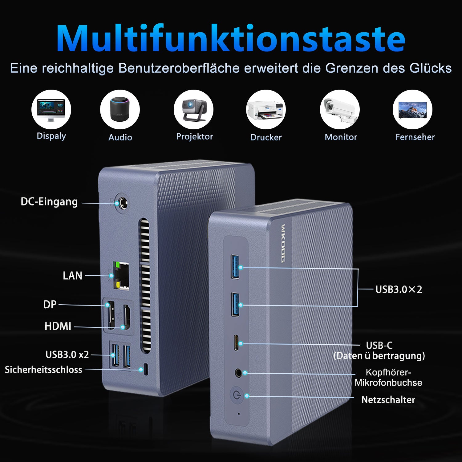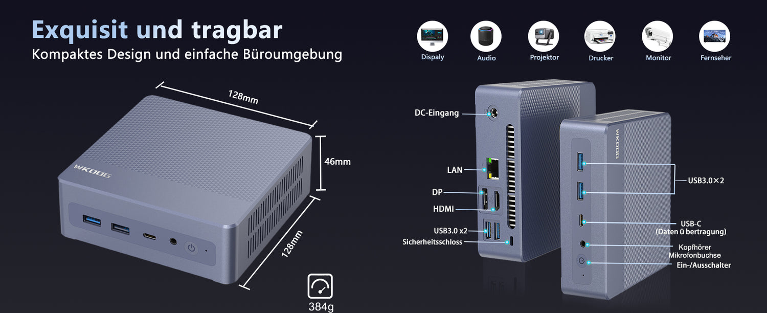 DC-Stromanschluss ¢5,5 mm*1, USB 3.0*4, RJ45 1000M*1, HDMI*1, DP*1,(4K,60Hz), Audioanschluss (HP&MIC)*1, Daten Typ-C (USB 2.0)*1 |